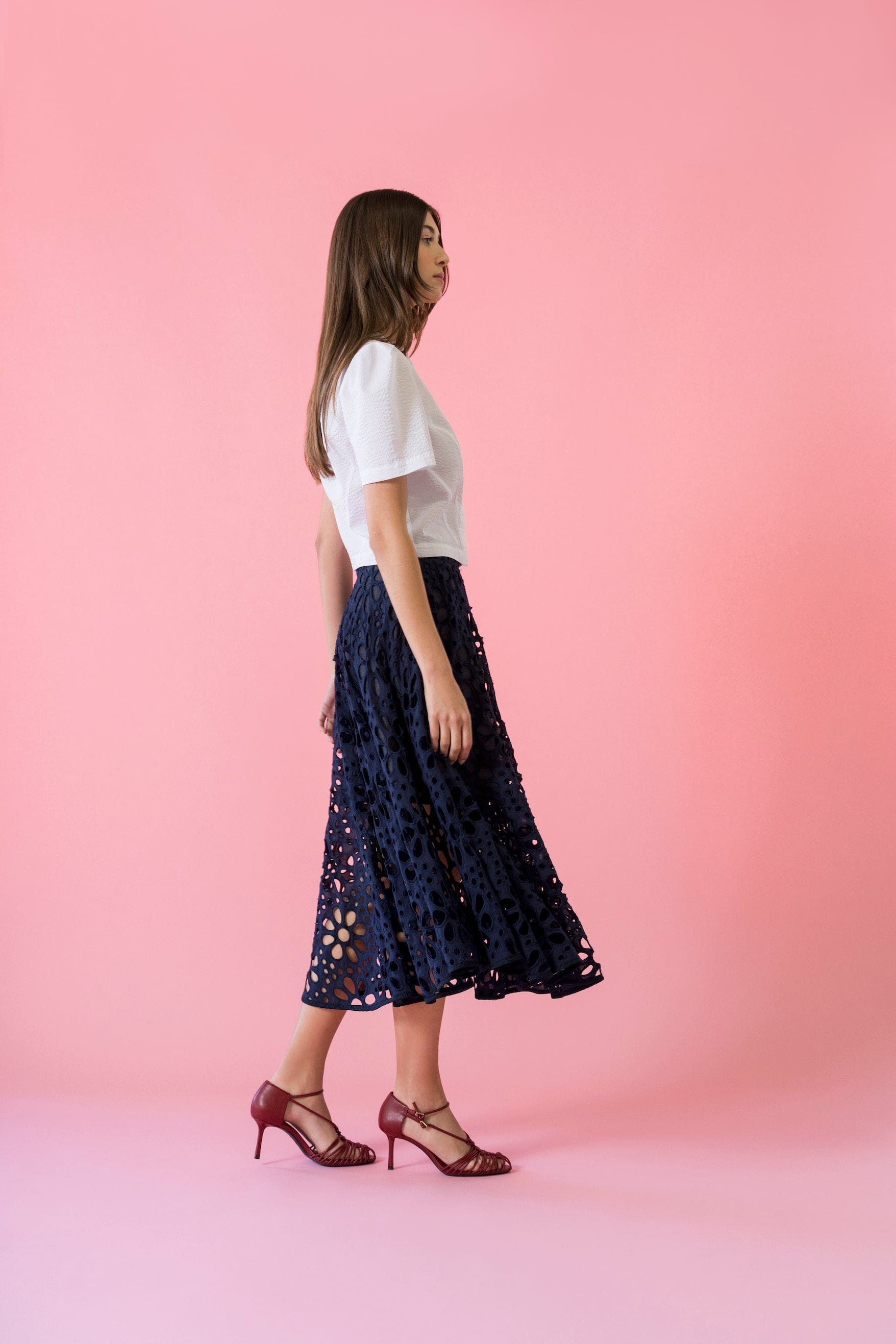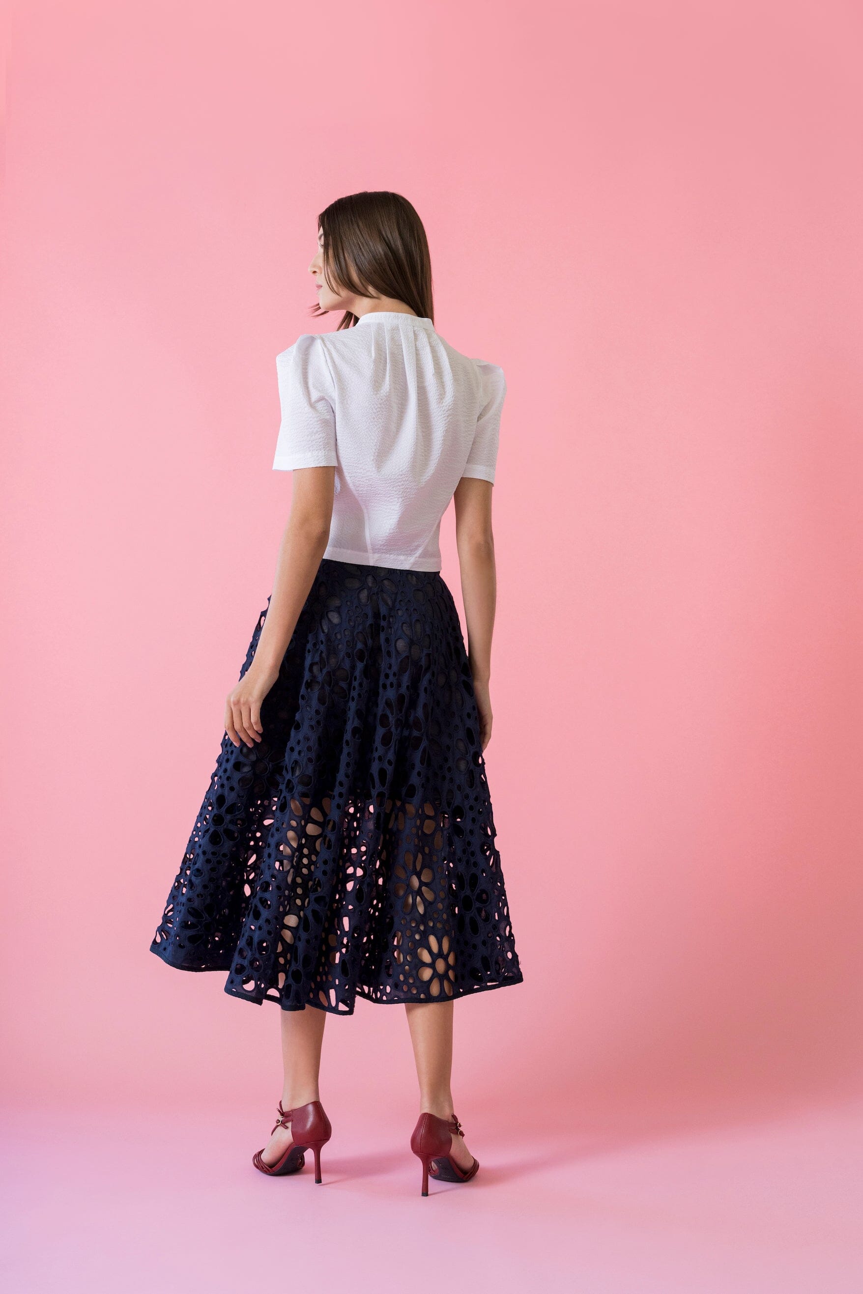 The Jude top is a refined short-sleeve blouse cut from wrikle finished Japanese white cotton Featuring princess seams and a hidden button front, it delivers a clean, tailored silhouette with subtle structure. Its cropped, boxy fit offers styling versatility, from polished pairings to relaxed weekend looks.