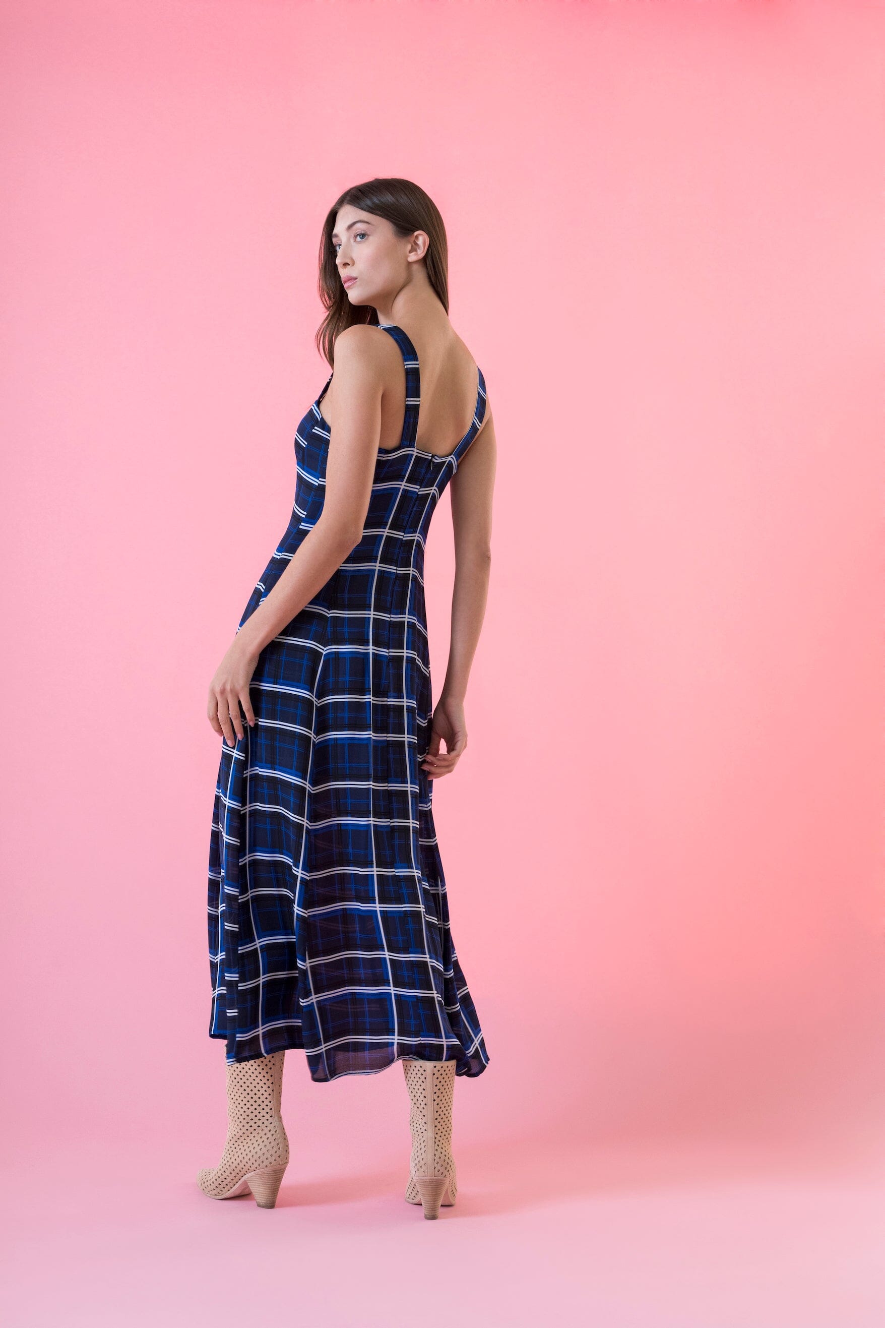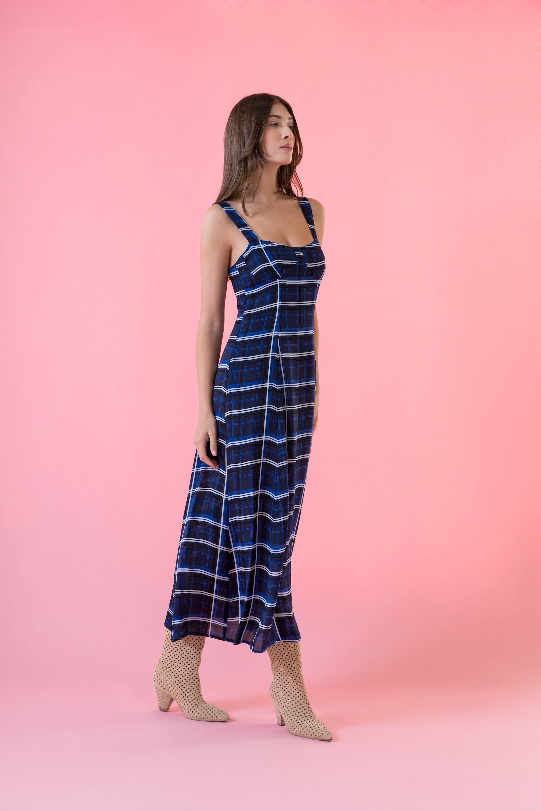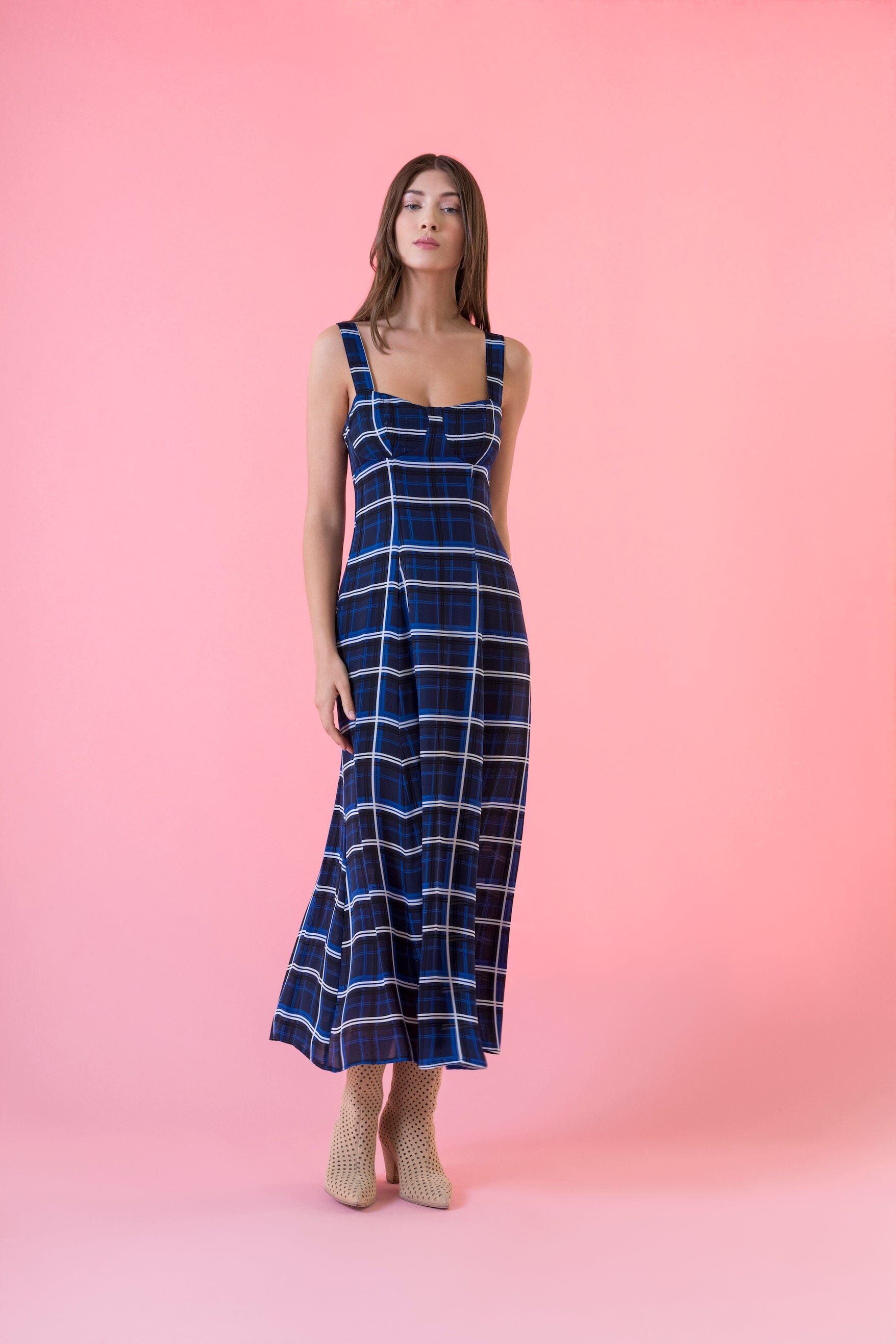 This elegant midi dress features a bold blue plaid pattern with a fitted bustier bodice and a sweetheart neckline, complemented by slim straps. The flowy A-line silhouette adds a feminine touch, making it perfect for daytime outings or casual gatherings, but can also be dressed up to be worn for more formal occasions.